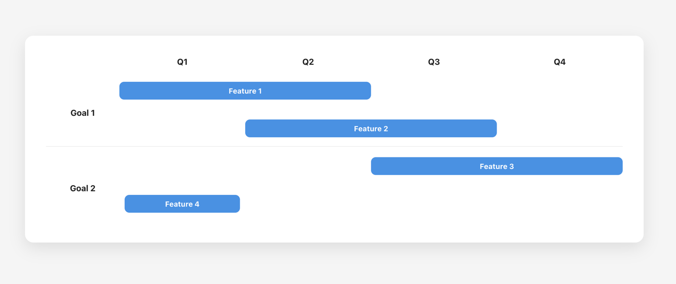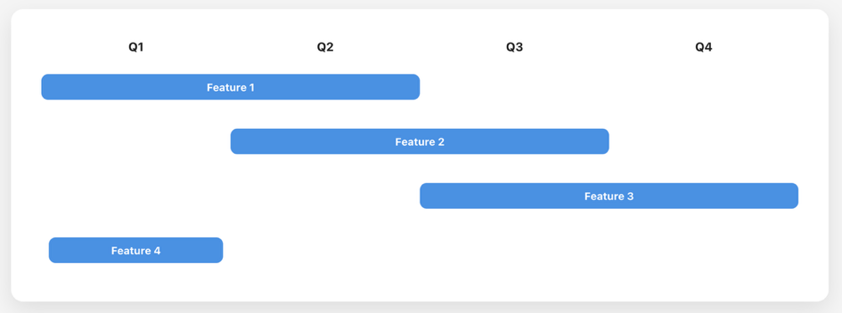It is a visual representation of your product vision, goals and high-level timelines. It can look like a project plan where bars represent features that are placed on the timeline. However, you can use other ways, e.g. a table view – as long as it can explain your priorities well.